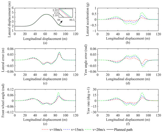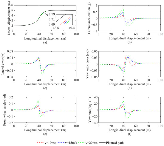 To verify the feasibility of the planned paths and to investigate the accuracy and stability of the improved LQR controller in terms of speed, two planned paths were tracked and tested at three different vehicle speeds. The simulation results are shown in Figure 18 and Figure 19.