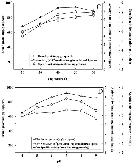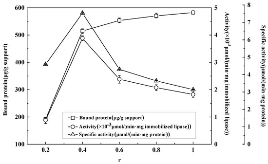The effects of different enzyme/support ratios (r) on immobilization were investigated, and the results are shown in Figure 2. With the increase in the ratio of the enzyme to the support, the activity and specific activity of the immobilized lipase increased initially and then decreased. When the ratio of lipase to support was 2:5, they reached the maximum. However, the bound protein increased significantly at enzyme-to-support ratios of less than 2:5. As the enzyme ratio was further increased, the increase in immobilized protein became smaller. As the amount of enzyme increases, the adsorption sites on the support are occupied by enzymes, and the support cannot bind more proteins. At the same time, the immobilization of lipase by unit mass support is limited. When the amount of lipase immobilized on the support reaches a certain level, increasing the amount of lipase cannot improve the bound protein. On the contrary, enzyme aggregates, or even multilayers of enzymes, are easily formed on the surface of the support, leading to a decrease in enzyme activity and specific activity [34]. Therefore, the optimal ratio of lipase to support is 2:5.