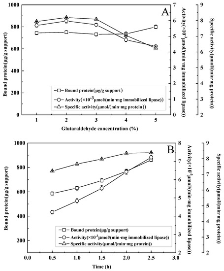 It can be seen from the effect of the reaction time (Figure 3B) that, with increasing covalent binding time, the amount of protein binding of the immobilized lipase increased linearly. At the beginning of immobilization, the activity of the immobilized lipase increased with the prolongation of the covalent binding time. After immobilization for 2 h, the activity of the immobilized enzyme remained unchanged with increasing reaction time. Therefore, 2 h was selected as the best immobilization time.