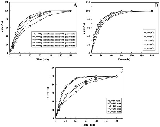 From the influence of the immobilized enzyme dosage in Figure 4A, it can be seen that at the same reaction time, with the increase in the immobilized enzyme dosage, the yield gradually increased, especially in the initial stage of the reaction (before 90 min). At the same time, it can be seen from the figure that the yield of citronellyl acetate obviously increased at the initial stage of the reaction. After 2 h of reaction, the yield tended to be stable. In a certain range of enzyme concentrations, the higher the enzyme concentration, the higher the probability of enzyme contact with the substrate was, and the faster the catalytic rate. The amount of enzyme is related not only to the reaction rate, but also has an important impact on the production cost of products. Taking into account the factors of yield and economic benefit, 0.3 g of immobilized lipase/0.05 g substrate was selected as the catalyst addition.