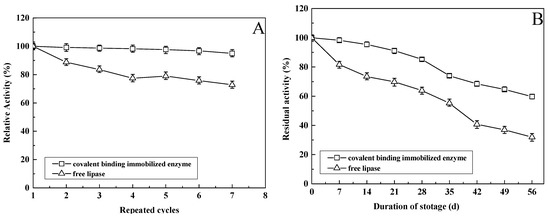 Comparison of the stability of free and immobilized lipases: (A) is operational stability and (B) is storage stability.
