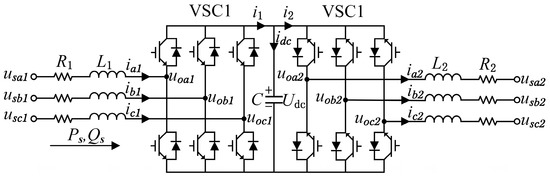Take VSC1 as an example; where is the three-phase voltage at the AC side, is the three-phase current at the AC side, is the three-phase voltage at the AC side of VSC, is the voltage at the DC side of VSC, is the current at the DC side of VSC, and is the active and reactive power input at the AC side. SOP mainly adjusts the power flow between systems through amplitude-phase or vector-control mode, and vector control can overcome the shortcoming of no current protection in amplitude-phase control. There are four operation modes for VSC [24,25]: fixed DC voltage control, fixed AC voltage control, fixed active power control, and fixed reactive power control. Under normal conditions, one VSC in the SOP controls the power transmission, while the other VSC controls the DC voltage. When a fault occurs, the fault detection VSC is adjusted to the fixed AC voltage control, and the nonfault side VSC is used to control the fluctuation of DC voltage. For detailed mathematical models and commutation principles of SOP, please refer to references [26,27].