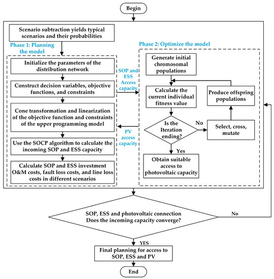 The model constructed in this paper is a mixed-integer nonlinear programming model. The access location and capacity of SOP and ESS are determined at the first stage and the model is solved by second-order cone programming (SOCP). In the second stage, a steady-state genetic algorithm (SSGA) is used to calculate the distributed PV access capacity. In order to achieve an efficient solution, a hybrid algorithm of second-order cone programming and steady-state genetic algorithm (SOCP-SSGA) is proposed in this paper to solve the two-stage programming model.