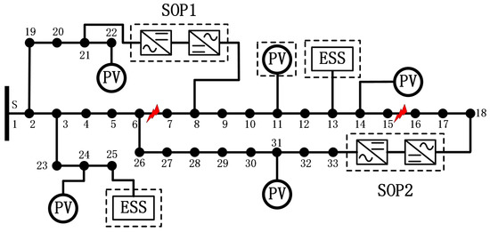 In recent years, with the continuous development and popularization of renewable energy, distributed photovoltaic power generation has become an important part of the distribution network. However, large-scale distributed photovoltaic access brings huge challenges to the distribution network, such as voltage instability, photovoltaic capacity limitation, and loss increase [1,2]. In order to solve these problems, SOP and ESS technologies have been widely applied in the distribution network [3,4]. Therefore, how to effectively plan the access of SOP and ESS to improve the reliability and economic benefits of the grid has become one of the hot spots of current research, and researchers at home and abroad have carried out a large number of studies on the access of SOP and ESS.