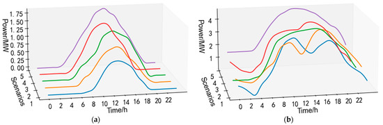 Photovoltaic and load scenarios with daily output curves: (a) photovoltaic; (b) load.