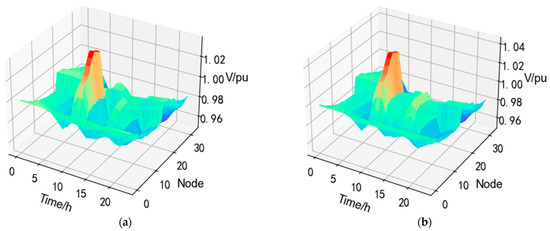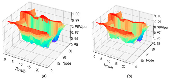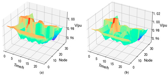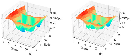 No SOP and ESS were installed in the system and a photovoltaic unit was connected at node 11. The SSGA algorithm was used to optimize the photovoltaic access capacity and calculate the economic components. The optimized PV capacity and economic costs are shown in Table 3 and Table 4, respectively. The voltage changes at each node throughout the day before and after the optimization of PV are shown in Figure 5a,b.