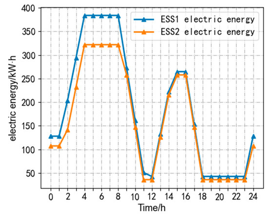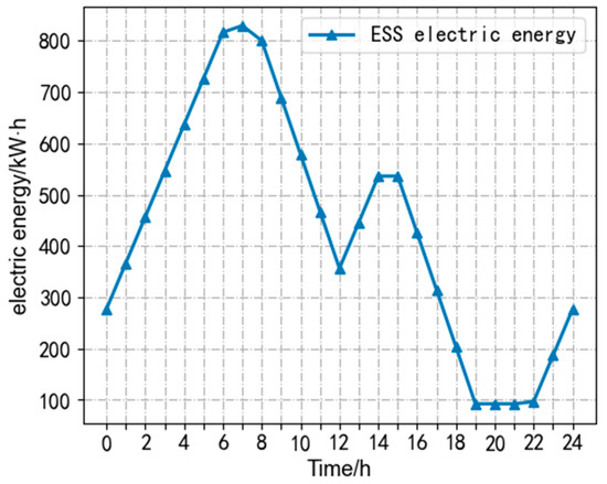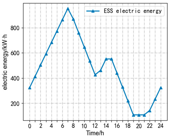 A set of SOP and ESS are installed at random locations. The random installation location of SOP is between nodes 12 and 22; the random access to ESS is node 15; and a group of photovoltaic units are connected at node 11, and the access capacity of each component is solved by the optimization algorithm optimization. The configuration and economic cost of each capacity after optimization are shown in Table 5 and Table 6. The voltage changes at each node throughout the day before and after the optimization of PV are shown in Figure 6a,b. The active power output and reactive power compensation of the SOP during daily operation after optimization are shown in Figure 7a,b, and the daily operating energy of the ESS is shown in Figure 8.