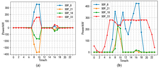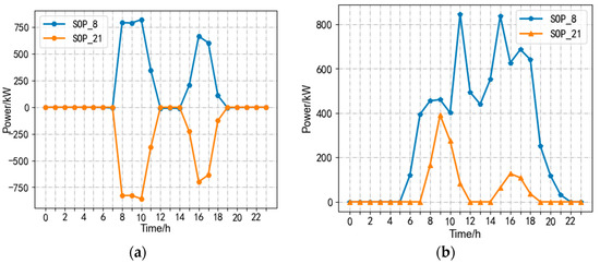 From Figure 6, it can be seen that the installation of SOP and ESS changes the voltage distribution at each node, while the installation of photovoltaic units raises the voltage at each node. From Figure 4 and Figure 7, it can be seen that during the time periods of 6:00–11:00 and 14:00–19:00, when the system load is high, SOP provides reactive power compensation to balance the power distribution in the system. As can be seen from Figure 8, ESS will charge before the peak load, and supply power to the grid after the peak to balance the load burden. The charging power is low at 14:00 because the PV output power is high at this time and the load is lower than in the morning session, therefore, the demand for ESS power is correspondingly reduced.