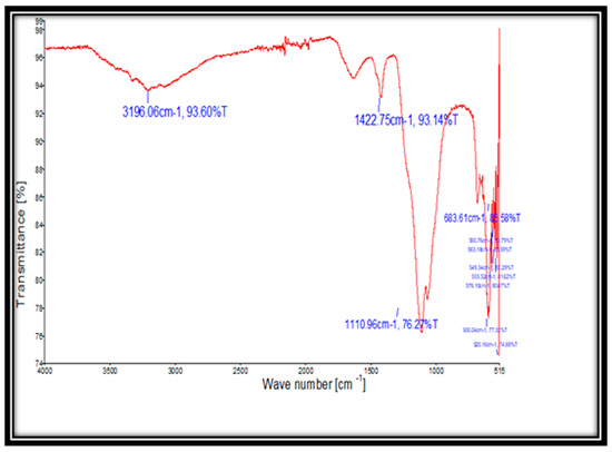 The surface structural characteristics of the green synthesized CuO are investigated in the analysis of FT-IR and the data obtained are shown in Figure 4. The spectrum of saturated hydrocarbons, C-H, and carbonyl groups, which correspond to the green surfactant present on the surface of CuO NPs, revealed deepening and bending vibrational maxima. The stretching and bending viable of Alkenes (C=C-H) groups and aromatic groups could be a broad pin absorption of 3196.06 and 1422.75 cm−1, respectively. At 1110.96 cm−1, the strong extending bow shows the extension of the group (C-O-C) Alkyls or of the ether. The strong bending peaks at 683.86 and 600.01 cm−1 are shown at the spectrum, which reveals the characteristics of each functional group on the surface of CuO NPs which corresponds to bending vibrations for the C-S connection. Halogen compounds can be allocated to the other peaks at 600 and 500 cm−1. C–O is an indicator of metal–oxygen bonds (Cu–O) in CuO NPs that confirms their chemical formation.