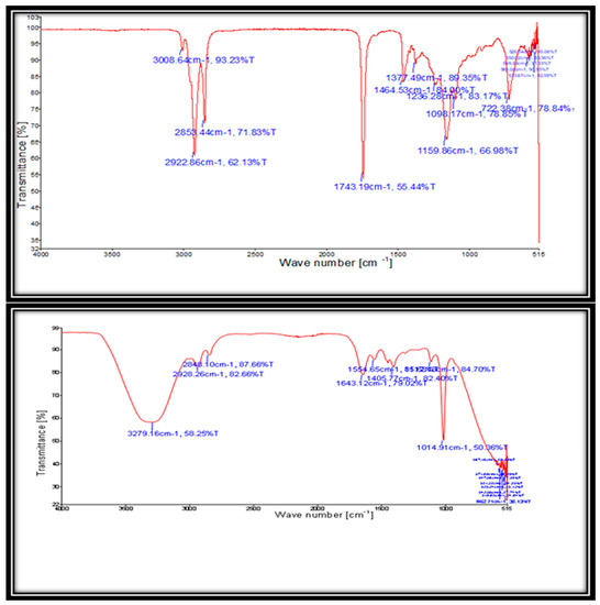 FT-IR is an efficient and fast approach for analyzing the formation of FAME after the transesterification reaction has already been completed [52]. FT-IR spectroscopy was used to detect formation of fatty acid methyl esters (FAMEs) after transesterification as an accurate technique. A clear indicator of their corresponding methyl ester is CTBD FT-IR spectrum using CCSOC (C. colocynthis seed oil cake, CuONPs (Figure 6). Various bands of synthesized biodiesel were detected in the spectrum representing different functional groups. C. colocynthis seed oil and biodiesel spectra are presented in Figure 6 in the mid-IR region (400–4000 cm−1). CTSO and CTBD spectra (Figure 6) do not appear very similar, with differences in band intensity and absorption rates possibly due to differing oils and biodiesel characteristics. Alcohols are present at the important peak observed in 3279.16 cm−1 (O-H stretch). The peaks are attributed to Alkanes, albeit at 2928.26 cm−1 (sp3C-H stretch). In contrast, the Aldehydes represent a peak of 2848.10 cm−1 (sp2C=O stretch). The ester keto-enol peak is 1643.12 (C=O stretch). The result of Alkenes can be seen in the other peak at 1554.65 cm−1 (C=C stretch). Alkyl halides and aryl halides were attributed to the peak of 1405.77 cm−1 (spreading bend for ester group). R1-C (OR) = O for the oil group, whereas R1-C (OCH3) = O for the bio-diesel group. This can be called R1–C (OR). The peaks show the bent vibrations of CH2 and CH3 in biodiesel and oil, respectively, and 1464, 1377, and 1089, but also 1112 and 1014 cm−1 (C-O primary and secondary alcohol stretches are the confirmation of the esters). At 1236 cm−1, which is absent in seed oil spectrums, the highest elevation of the biodiesel conversion of methyl ester is found. The ester control signal is shown at another 1112 cm−1 peak. There is a powerful, broad signal in CTSO at 1743 cm−1 and 1643 cm−1 (signal strong) (Figure 6). The peak shows a -CH2 waging for oils, which is not present in biodiesel spectra at 1743 cm−1, 1464 cm−1, 1377 cm−1, 1236 cm−1, and 1159 cm−1. The confirmation of biodiesel formation shows all related justifications in the above texts and pits.