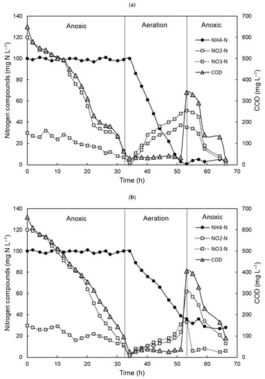 The operations of H-SBR and N-SBR were performed in comparison to investigate differences in SBNR performance. After repeating the one-cycle operation five times or more, stable removals of nitrogen compounds and COD were achieved in both reactors. Figure 2 shows the variations of nitrogen compounds and organics in one-cycle operations of the reactors. The initial concentration of total nitrogen including NH4-N, NO2-N, and NO3-N in the landfill leachate introduced into the reactor was 250 mg N L−1 and the COD concentration was 660 mg L−1, indicating a COD/T-N ratio of 2.64. The NO2-N and COD contained in the leachate were reduced to 10 mg N L−1 and 26 mg L−1, respectively, through a denitrification process under the first anoxic conditions. After the first anoxic denitrification process was completed, an aerobic operation for partial nitrification was performed. In the H-SBR, 62 mg N L−1 of NO2-N was accumulated at the end of the aerobic operation with the occurrence of nitrite accumulation. However, in the N-SBR reactor, the nitrate concentration was higher than the nitrite concentration. After the aerobic operation, the reactors operated under anoxic conditions again to achieve shortcut nitrogen removal. In this operating period, 400 mg L−1 of glucose was supplemented as an external carbon source. NH4-N removal in the N-SBR was incomplete and the effluent nitrogen concentration was higher than in the H-SBR.