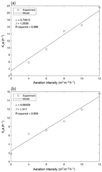 where d is the diameter of bubbles (m), f is the aerator band width (m), B is the diameter of the reactor (m), I is the aeration intensity (m3 m−2 h−1), H is the reactor depth (m), and α and β are the calibrating constants. The calibration of α and β values was performed using the nonlinear least squares method [32,33]. The calculations and modeling graphs were carried out using MATLAB R2021b software (MATLAB R2021b, MathWorks, Portola Valley, CA, USA).