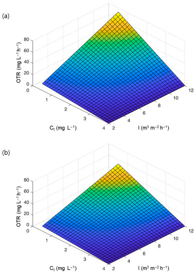 OTR changes in H-SBR (a) and N-SBR (b) according to DO concentration (Ct) and aeration intensity (I).