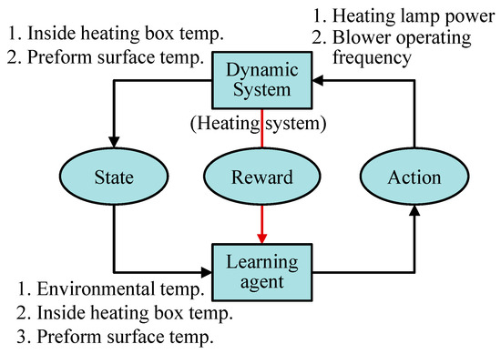 In the application of intelligent temperature control, RL has been gradually applied to HVAC control systems. In Ref. [17], an RL algorithm with dual safety policies is proposed for energy savings. This RL model incorporates safety measures into the optimization process by imposing penalties on actions that violate safety constraints. The integration of safety into the RL framework enhances the safety of the controlled HVAC systems while concurrently achieving energy savings. Experimental results show that this RL model reduces energy consumption of an HVAC system by more than 15.02% compared with PID control. Fang et al. [18] utilized the DQN method in a variable air volume (VAV) system to achieve energy savings while ensuring indoor thermal comfort. The effectiveness of the DQN method was evaluated in comparison to rule-based control (RBC) by controlling the setpoints of the air supply temperature and chiller water supply temperature. Their findings demonstrated that, in most cases, the DQN method outperformed RBC in terms of control efficiency. In Ref. [19], the authors propose a model-free actor-critic RL controller, which incorporates a variant of artificial recurrent neural networks known as long-short-term memory (LSTM) networks. The RL controller aims to optimize thermal comfort while minimizing energy consumption. The training and validation results demonstrate that this RL controller improves thermal comfort by an average of 15% and energy efficiency by an average of 2.5% when compared to other alternative strategies. As mentioned earlier, the manufacturing technique of PET bottles has gained widespread popularity. Nevertheless, there has been little research on intelligent temperature control methods within the manufacturing process.