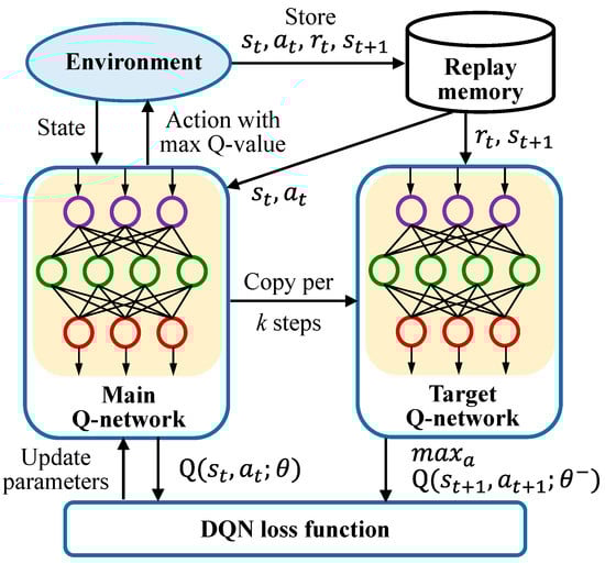 where denotes the discount factor (a value between 0 and 1) which is the effect of future rewards to the current decision-making. Finally, the loss function can be optimized by using the stochastic gradient descent (SGD) algorithm.
