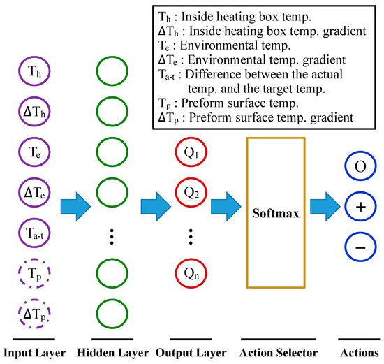 In the first stage, the machine is operated without preforms, with the inside heating box temperature serving as the control target of DQN. In the second stage, which is the same as the official production, the machine is operated with preforms and the control target of DQN is the preform surface temperature. Therefore, in the first stage of experiments, the input layer has five parameters, including the inside heating box temperature, the inside heating box temperature gradient, the environmental temperature, the environmental temperature gradient, and the difference between the actual temperature and the target temperature. In the second stage of the experiments, two additional parameters, namely, the preform surface temperature and the preform surface temperature gradient, were incorporated into the input layer in addition to the original five parameters.