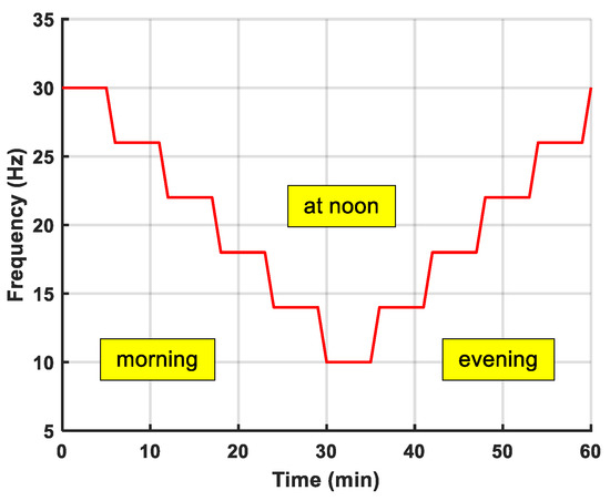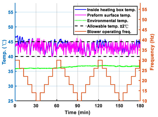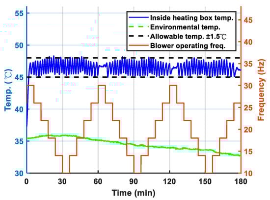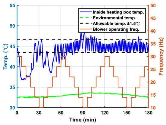 To expedite the algorithm’s training process, the blower in the heating box is employed as a disturbance source to simulate temperature variations resulting from the alternating day and night environment. As shown in Figure 6, the operating frequency of the blower is gradually increased from 10 Hz to 30 Hz, and subsequently gradually decreased from 30 Hz back to 10 Hz. This deliberate manipulation can induce a temperature differential exceeding 10 within the heating box. This approach effectively simulates scenarios with environmental temperature differentials surpassing 10 . Throughout the experiments, the blower’s operating frequency is adjusted in increments of 4 Hz every 6 min. In essence, this approach enables the simulation of an entire day’s (eight-hour workday) worth of environmental temperature changes within a one-hour timeframe, significantly reducing the required training time for the algorithm.