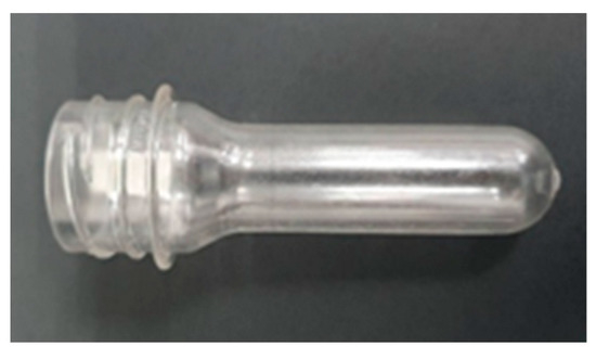 Stretch blow molding is the main technology used in the production of PET bottles. The initial step in the production process involves injecting PET resin into a tube-shaped mold, resulting in the formation of specific structurally preforms. Subsequently, the preforms undergo heating in an infrared heating box, surpassing the glass transition temperature. Concurrently, they are subjected to stretching with a stretch rod and inflation using high-pressure air, thereby achieving the desired bottle shapes. Cooling of the bottles occurs within the mold, followed by their ejection. The entire deformation process is completed within a few seconds. The performance characteristics of PET bottles produced through this method are influenced by three primary variables: the initial shape of the preform, the initial temperature of the preform, and the balance between stretching and blowing rates [2]. During the initial stage (injection molding stage) of the production process, two types of deformations occur, namely, volumetric shrinkage and warpage. Warpage in PET leads to an uneven material distribution across the surface of the preform wall, causing variations in wall thickness. When carbonated drinks are filled into the preforms, high pressure is applied, particularly at areas with minimal wall thickness, leading to the formation of high-stress concentrations. Consequently, under elevated pressure, preforms experience rupture at locations with maximum warpage (areas of stress concentration), resulting in loss of both the beverage and the preform. The findings of Ref. [3] demonstrate that ambient and melting temperatures are the most critical parameters contributing to warpage.