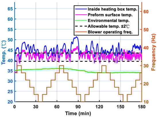In the second stage of the experiments, the DQN’s target temperature is set at 41.5 . Throughout the DQN training process, the temperature variation disturbance simulation illustrated in Figure 5 is repeatedly conducted three times. The experimental results are depicted in Figure 10. In contrast to the first stage of experiments, the input layer of DQN was increased by two new parameters: the preform surface temperature and the preform surface temperature gradient. With the increase in the number of input parameters in the DQN, the training complexity of the DQN model also escalates. Consequently, the experimental results reveal that the training of the DQN reaches a stable state after two hours. The temperature of the PET preform surface can be controlled within the allowable range (within ±2 of the target temperature). Furthermore, the variation trend of the preform surface temperature demonstrates a positive correlation with the temperature change trend in the heating box.