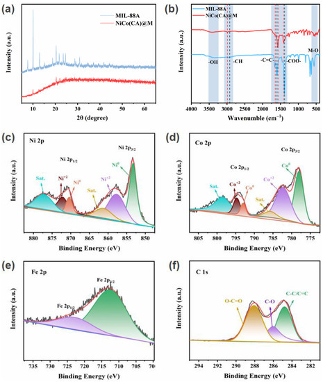 (a) XRD of the MIL-88A and NiCo(CA)@M. (b) FTIR spectra of NiCo(CA)@M. XPS spectra of the NiCo(CA)@M: (c) Ni 2p; (d) Co 2p; (e) Fe 2p; and (f) C 1s.
