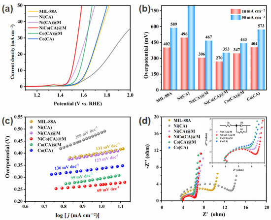 Electrochemical tests were performed on this type of catalyst using a three-electrode system at 1 M KOH to investigate the OER activity of different catalysts. The LSV polarization curves are shown in Figure 3a. The LSV curve of the carrier MIL-88A shows poor OER activity (η10 = 402 mV), which is fundamentally due to the high impedance of the metal-organic framework. The composite NiCo(CA)@M has an optimal OER activity compared to the corresponding catalyst, requiring only 270 mV overpotential to reach 10 mA cm−2 (η10 = 270 mV), while the η10 for MIL-88A, Ni(CA), Ni(CA)@M, NiCo(CA)@M, Co(CA)@M, and Co(CA) were 402, 484, 296, 337, and 397 mV, respectively, and thus indicated that NiCo(CA)@M had excellent OER activity. To compare the differences in overpotentials more visually, histograms of overpotentials were plotted as shown in Figure 3b to illustrate the effect of loaded nickel–cobalt nanoparticles on OER activity. The overpotential of NiCo(CA)@M at 10 mA cm−2 was compared with the previously reported electrocatalysts for OER activity as shown in Table S3, which was superior to that of CoMo-MI-600 (η10 = 316 mV) [41], Co-Fe-BDC (η10 = 295 mV) [42], NiFe-MOF (η10 = 390 mV) [43], NiCoP/NF (η10 = 370 mV), [44] and UTSA-16 (η10 = 408 mV) [36]. The results showed that the composite NiCo(CA)@M had a smaller overpotential than the pure MIL-88A and the pure nanoparticles. Apparently, the reasonable loading of nanoparticles on the metal skeleton helped to introduce new active sites and reduced agglomeration, and the rough surface exposing additional active sites may also provide more channels to accelerate electron transport. At the same time, both the synergistic effect [45] between the transition metals and the charge redistribution within the composite contributed to the intrinsic activity of the catalyst.