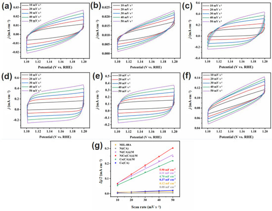 The bilayer capacitance Cdl is theoretically positively correlated with the value of the electrochemical surface area (ECSA). Herein, cyclic voltammetry (CV) was chosen to test the cyclic voltammetry curves of the catalysts located in the non-Faraday region at different sweep rates, and the bilayer capacitance (Cdl) of this type of catalysts was calculated to evaluate the electrochemically active surface area (ECSA). Figure 4a–f show the CV curves of MIL-88A, Ni(CA), Ni(CA)@M, NiCo(CA)@M, Co(CA)@M, and Co(CA), respectively. The results are shown in Figure 4g, and the Cdl value for NiCo(CA)@M was 5.90 mF cm−2, above Ni(CA)@M (4.70 mF cm−2) and Co(CA)@M (4.11 mF cm−2). Even 73.75,49.16 and 15.95 times of Ni (CA) (0.08 mF cm−2), MIL-88A (0.12 mF cm−2) and Co(CA) (0.37 mF cm−2), respectively, indicated that NiCo(CA)@M had a larger activity surface area and also demonstrated that proper loading of nickel-cobalt nanoparticles on MOF can effectively increase or expose more catalytic active sites.