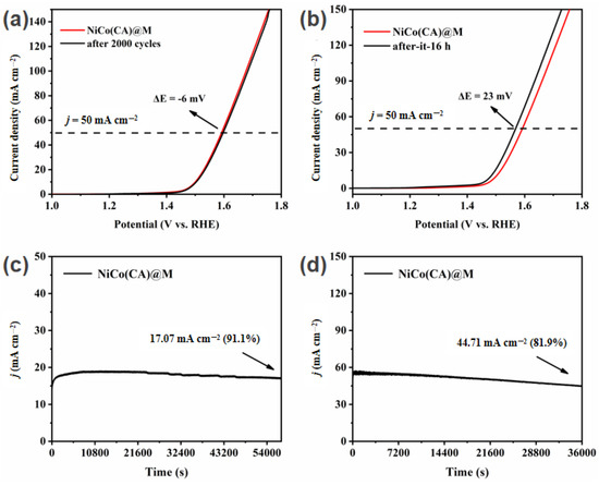 Stability is another critical parameter for evaluating the catalyst’s performance. The scan rate was set to 10 mV s−1 and the NiCo(CA)@M catalyst was subjected to 2000 CV cycles in 1 M KOH, and then the LSV curves before and after the catalyst cycles were tested (Figure 5a) and compared in terms of the overpotential differences at a current density of 50 mA cm−2. The results proved that the overpotential only increased by 6 mV after 2000 CV cycles and still maintained good electrocatalytic activity. The potential was reduced by 23 mV after the 16 h i-t test, which may be due to the surface reconstruction of the catalyst during the i-t test under the conditions of the applied potential, which generated an active structure with better electrocatalytic activity, which also indicates the good durability of the composite. To further explore the long-term stability of this catalyst, a chrono-current test was performed. Figure 5c showed that the NiCo(CA)@M catalyst maintained 91.1% of the initial current density after 16 h of operation at a current density of 10 mA cm−2. Meanwhile, after a 10 h i-test at a high current density of 50 mA cm−2, the current density retention of the NiCo(CA)@M catalyst was 81.9%. This fully indicated that the long-term stability of the NiCo(CA)@M catalyst was excellent. In conclusion, the composite showed good cycling durability and long-term stability.