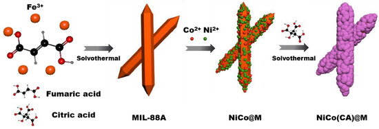 NiCo(CA)@M micro sticks were synthesized according to the experimental flow and design ideas shown in Scheme 1. Firstly, FeCl3·6H2O was dispersed in deionized water containing fumaric acid and then underwent a hydrothermal reaction to generate the metal-organic frame (MIL-88A). Subsequently, we took parts of the metal-organic framework dispersed in DMF and added cobalt nitrate and nickel nitrate. Through a cation exchange reaction, part of the nickel source and cobalt source became fixed to the MIL-88A instead of iron atoms. After that, the citric acid (CA) as a ligand was added to coordinate with the nickel and cobalt ion and the complexation reaction through solvent heat, and the nickel–cobalt nanoparticles were grown in situ on the MOF to achieve the purpose of dispersing the nickel–cobalt nanoparticles.
