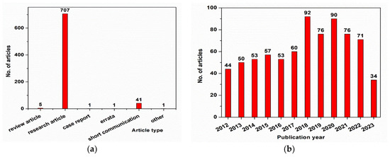 (a) Evolution of the published articles in the field of Fe3O4 core–shell nanoparticles; (b) types of papers published in the field of Fe3O4 core–shell nanoparticles.