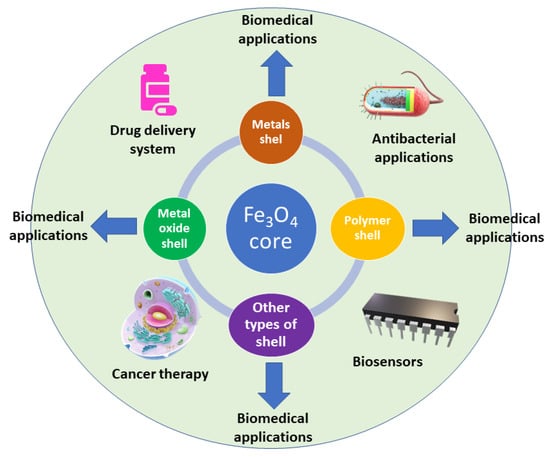 A schematic representation of Fe3O4-based core–shell nanoparticles with various types of shells for biomedical applications is shown in Figure 2.