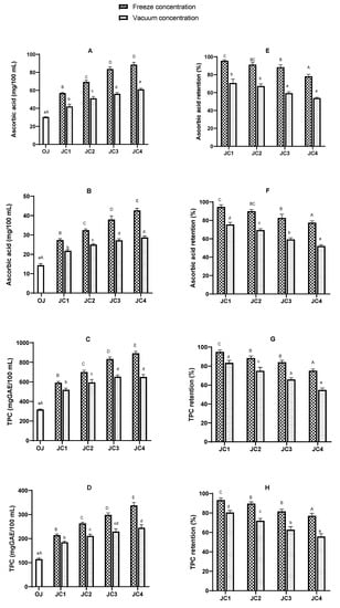 Changes in ascorbic acid, TPC contents, and retention (A,C,E,G in C. latifolia; B,D,F,H in C. limonia) during freeze and vacuum concentrations. The values are expressed as mean ± SD of triplicates. Different uppercase letters indicate a significant difference (p < 0.05) between freeze-concentrated juices. Different lowercase letters indicate a significant difference (p < 0.05) between vacuum-concentrated juices. OJ: original juice, JC: juice concentrate.