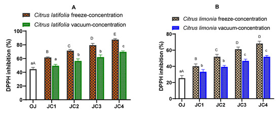Changes in DPPH scavenging activity of (A) C. latifolia and (B) C. limonia lime juices during freeze and vacuum concentrations. The values are expressed as mean ± SD of triplicates. Different uppercase letters indicate a significant difference (p < 0.05) between freeze-concentrated juices. Different lowercase letters indicate a significant difference (p < 0.05) between vacuum-concentrated juices. OJ: original juice, JC: juice concentrate.