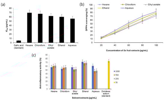 (a) IC50 value (µg/mL) of different solvent extracts of S. xanthocarpum. (b) DPPH free radical scavenging activity of different solvent extracts of S. xanthocarpum. (c) Anti-inflammatory activity of different solvent extracts of S. xanthocarpum.