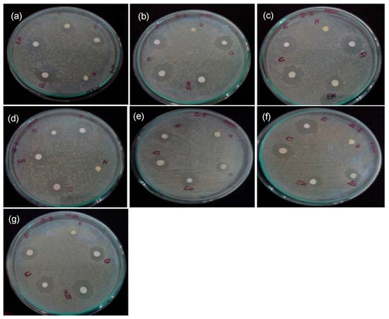 Antibacterial activity of different solvent extracts of S. xanthocarpum (a–g) Zone of inhibition observed in samples S1 to S7.H—hexane, D—distilled water/aqueous, EA—ethyl acetate, C—chloroform, E—ethanol.