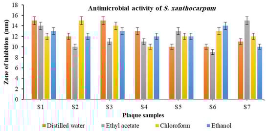 Antibacterial activity of different solvent extracts of S. xanthocarpum shows the measurement in inhibition zones against bacteria from plaque biofilm.
