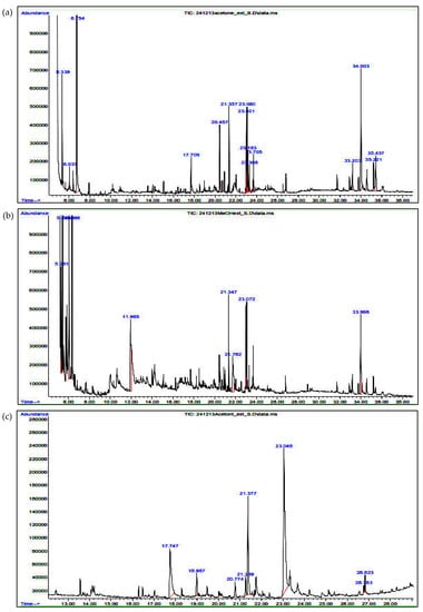 (a) GC-MS chromatogram formed by the aqueous crude extract of S. xanthocarpum. (b) GC-MS chromatogram formed by sub-fraction 1 of aqueous crude extract of S. xanthocarpum. (c). GC-MS chromatogram formed by the sub-fraction 2 of aqueous crude extract of S. xanthocarpum.