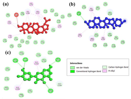The binding interaction of the ligands with the binding site residues is shown in 2D representation. (a) Lupeol, (b) Solasodine and (c) Quercetin.