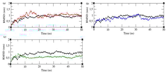 RMSD plot for the backbone carbon atoms of Gingipain R2 protein bound to complexes. (a) Lupeol complex. (b) Solasodine complex. (c) Quercetin complex. Apo-protein is colored black.