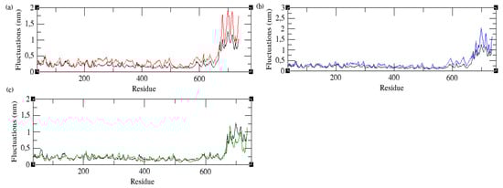 RMSF plot of the residues in Gingipain R2 protein bound to complexes. (a) Lupeol complex. (b) Solasodine complex. (c) Quercetin complex. Apo-protein is colored black.
