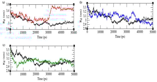 The radius of gyration of Gingipain R2 protein–ligand complexes. (a) Lupeol complex. (b) Solasodine complex. (c) Quercetin complex. Apo-protein is colored black.