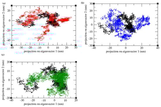 Projection of PC1 and PC2 of Gingipain R2 protein–ligand complexes. (a) Lupeol complex (b) Solasodine complex. (c) Quercetin complex. Apo-protein is colored black.