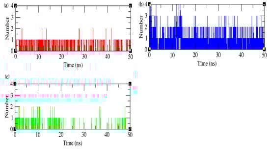 Number of hydrogen bonds formed in the Gingipain R2 protein–ligand complexes. (a) Lupeol complex. (b) Solasodine complex. (c) Quercetin complex.