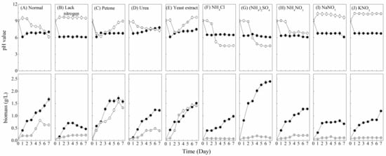 Chlorella sp. G3H3-1-2 biomass and pH variation at various nitrogen sources. Culture condition: light/dark cycle: 24/0; light source: fluorescent; light intensity: 4300 lux; carbon sources: sucrose 1.0 g/L; various nitrogen sources; aeration: 10% CO2; n = 3. Note: (A,B): autotrophic cultivation; (C–J): mixotrophic cultivation. (●) aeration rate 0.5 vvm, 10% CO2; (○) with no aeration.