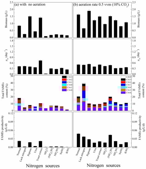 The highest μm of 0.7 day−1 was obtained using the yeast extract nitrogen source with no aeration. This value is much higher than the values from 0.2–0.3 day−1 while adding other nitrogen sources (peptone, urea, NH4Cl, (NH4)2SO4, NH4NO3, NaNO3 and KNO3) with the no-aeration condition. Under the CO2 exposure condition, the μm values (about 0.3 day−1) were lower when culturing with NO3− nitrogen sources (NH4NO3, NaNO3 and KNO3).