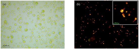 Microscopic images of Chlorella sp. G3H3-1-2 cells stained with Nile red staining: (a) bright field, (b) fluorescence microscopy.