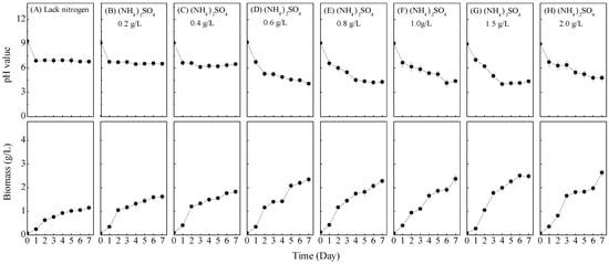 Chlorella sp. G3H3-1-2 biomass and pH variation at various (NH4)2SO4 concentrations. Culture conditions: light/dark cycle: 24/0; light source: fluorescent; light intensity: 4300 lux; carbon sources: sucrose 1.0 g/L; various (NH4)2SO4 concentrations; aeration: 10% CO2; Aeration rate 0.5 vvm, 10% CO2; n = 3. Note: (A): autotrophic cultivation. (B–H): mixotrophic cultivation.