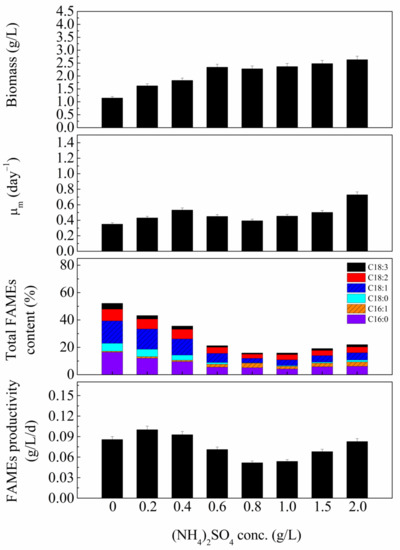 Nitrogen limitation conditions may activate diacylglycerol acyltransferase and increase the fatty acid acyl-CoA intracellular content, and then convert fatty acid acyl-CoA into triglyceride []. Accordingly, microalgae under low nitrogen concentration could increase the total FAMEs. Conversely, the higher (NH4)2SO4 concentration increased microalgal cell growth but decreased FAMEs production.