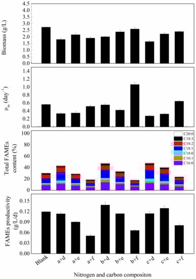 As shown in Figure 6, compared with these three carbon sources, a higher total FAMEs content (around 49%) under the culture condition of 0.2 g/L (NH4)2SO4 as nitrogen source was obtained when sucrose was the carbon source. The highest total FAMEs productivity (around 0.13 g/L/d) under the culture condition of 0.2 g/L (NH4)2SO4 as nitrogen source was obtained when glycerol was the carbon source. The results reported above indicate that the higher total FAMEs content (>40%) with glucose, glycerol or sucrose as the carbon source was obtained using (NH4)2SO4 0.2 g/L as the nitrogen source. This may be attributed to Chlorella being more adaptable to grow in the culture condition of nitrogen limitation [].