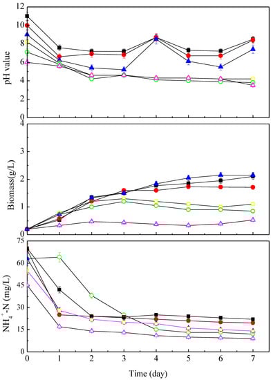 Chlorella sp. G3H3-1-2 biomass and NH4+-N variation at various pH values. Culture conditions: light/dark cycle: 24/0; light source: fluorescent; light intensity: 4300 lux; nitrogen sources: (NH4)2SO4 0.2 g/L; carbon sources: glucose 1.0 g/L; aeration: 10% CO2; n = 3. Note: pH value: pH value: (△) pH 6; (○) pH 7; (○) pH 8; (▲) pH 9; (●) pH 10; (█) pH 11.