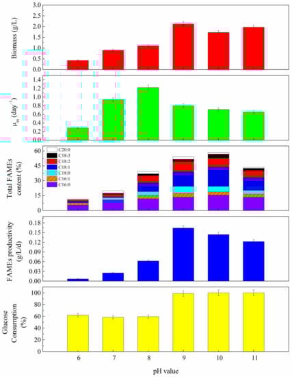 Culture pH is one of the main controlling factors influencing microalgae cultivation. Generally, most microalgal species prefer to grow under neutral pH []. Therefore, searching for a suitable microalga strain that could withstand alkaline pH for biodiesel production is needed. Figure 7 shows the different initial pH levels in the culture medium on pH change, Chlorella sp. G3H3-1-2 biomass concentration and nitrogen consumption. Using glucose as an additional carbon source, the biomass concentration was increased from 0.4 to 2.2 g/L when the pH increased gradually from 6.0 to 9.0. However, the biomass concentration was slightly decreased when the pH was continuously increased to more than 9.0. Similarly, in terms of NH4+-N consumption, besides the pH 7 test group, the consumption trend presentation is approximately similar and leveled off at the next day. Microalgae can grow over a wide pH range (pH 6.0–11.0), but the most suitable pH was dependent on the species []. Figure 8 shows that the highest specific Chlorella sp. G3H3-1-2 growth rate was increased when the pH increased from 6.0 to 8.0 with glucose as an additional carbon source. The highest specific growth rate was reduced when the pH was continuously increased beyond 9.0. The highest total FAMEs content reached 59% at pH 10.0, while the highest FAMEs productivity (0.16 g/L/d) occurred at pH 9.0, due primarily to the higher biomass production at pH 9.0 (2.2 g/L). FAMEs productivity was calculated as the biomass productivity and FAMEs content result. Therefore, the best performances for both biomass and FAMEs production for Chlorella sp. G3H3-1-2 may be obtained at pH 9.0–10.0. This shows that the pH significantly affects the Chlorella sp. G3H3-1-2 growth and FAME concentration under mixotrophic conditions.